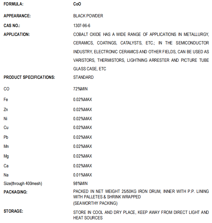 Cobalt oxide is the 1 important transition metal oxide. Usually used as the main raw material for the production of cemented carbide, superalloys, insulating materials and magnetic materials, as well as catalysts and dyes in the chemical industry.