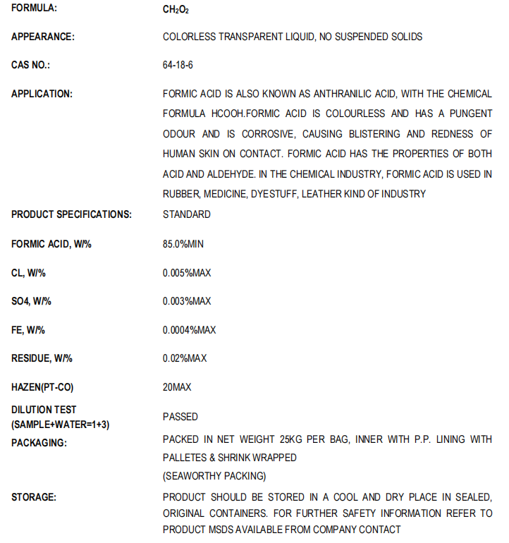 Formic acid is one of the fundamental organic chemical raw materials, widely used in industries such as pesticides, leather, dyes, pharmaceuticals, and rubber. It can be directly utilized in fabric processing, tanning, textile dyeing, and the storage of green feed, and it also serves as a metal surface treatment agent, a rubber additive, and an industrial solvent. In organic synthesis, formic acid is used to synthesize various formate esters, acridine dyes, and a series of pharmaceutical intermediates.