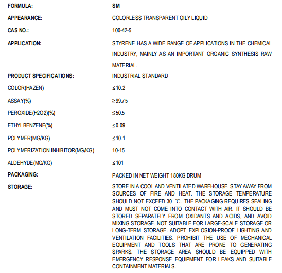 Styrene, a type of organic compound with the chemical formula C8H8, belongs to the category of organic compounds. Styrene is a colorless and transparent liquid that is insoluble in water but soluble in most organic solvents such as ethanol and ether. Styrene has a wide range of applications in the chemical industry, mainly as an important organic synthesis raw material. In the polymer industry, styrene is an important monomer material for synthesizing target polymers; Styrene is one of the important raw materials for synthetic rubber; Styrene can be used to synthesize synthetic fibers; Styrene is an important intermediate in the field of organic synthesis; Styrene and its derivatives have played an important role in the manufacturing of optical materials, electronic component packaging materials, etc. in the electronics industry; Styrene and its polymers can be used to manufacture optical materials; Styrene polymers are widely used in the construction and automotive industries, including the manufacture of insulation materials, insulation materials, automotive components, etc.