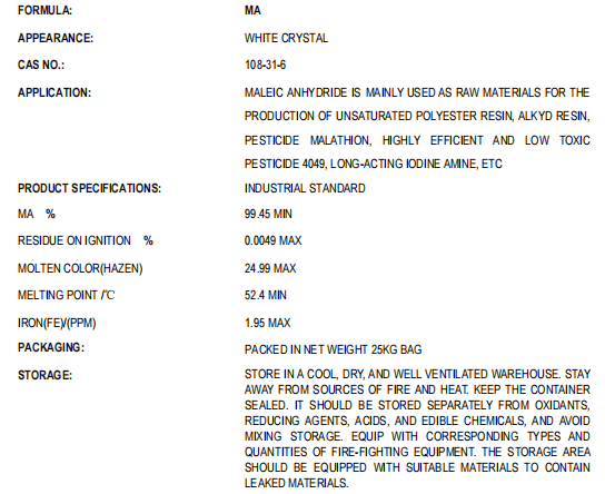 Maleic anhydride, also known as dehydrated malic anhydride, is the anhydride of maleic acid. It is a white crystal with a strong pungent odor at room temperature and has the chemical formula C4H2O3. Dissolve in most organic solvents such as water, acetone, benzene, chloroform, etc. Mainly used as a raw material for the production of unsaturated polyester resin, alkyd resin, pesticide malathion, high-efficiency and low toxicity pesticide 4049, long-acting iodine amine, etc.