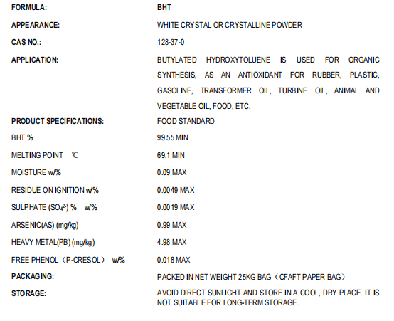 Butylated hydroxytoluene (BHT) is an organic compound with a molecular formula of C15H24O. It is a white crystalline powder that is easily soluble in ethanol, acetone, benzene, soybean oil, cottonseed oil, and lard, but insoluble in water, glycerol, and propylene glycol. BHT has been used for nearly 70 years and is the most widely produced phenolic antioxidant (known as an antioxidant in the rubber industry). Used for organic synthesis, as an antioxidant for rubber, plastic, gasoline, transformer oil, turbine oil, animal and vegetable oil, food, etc.